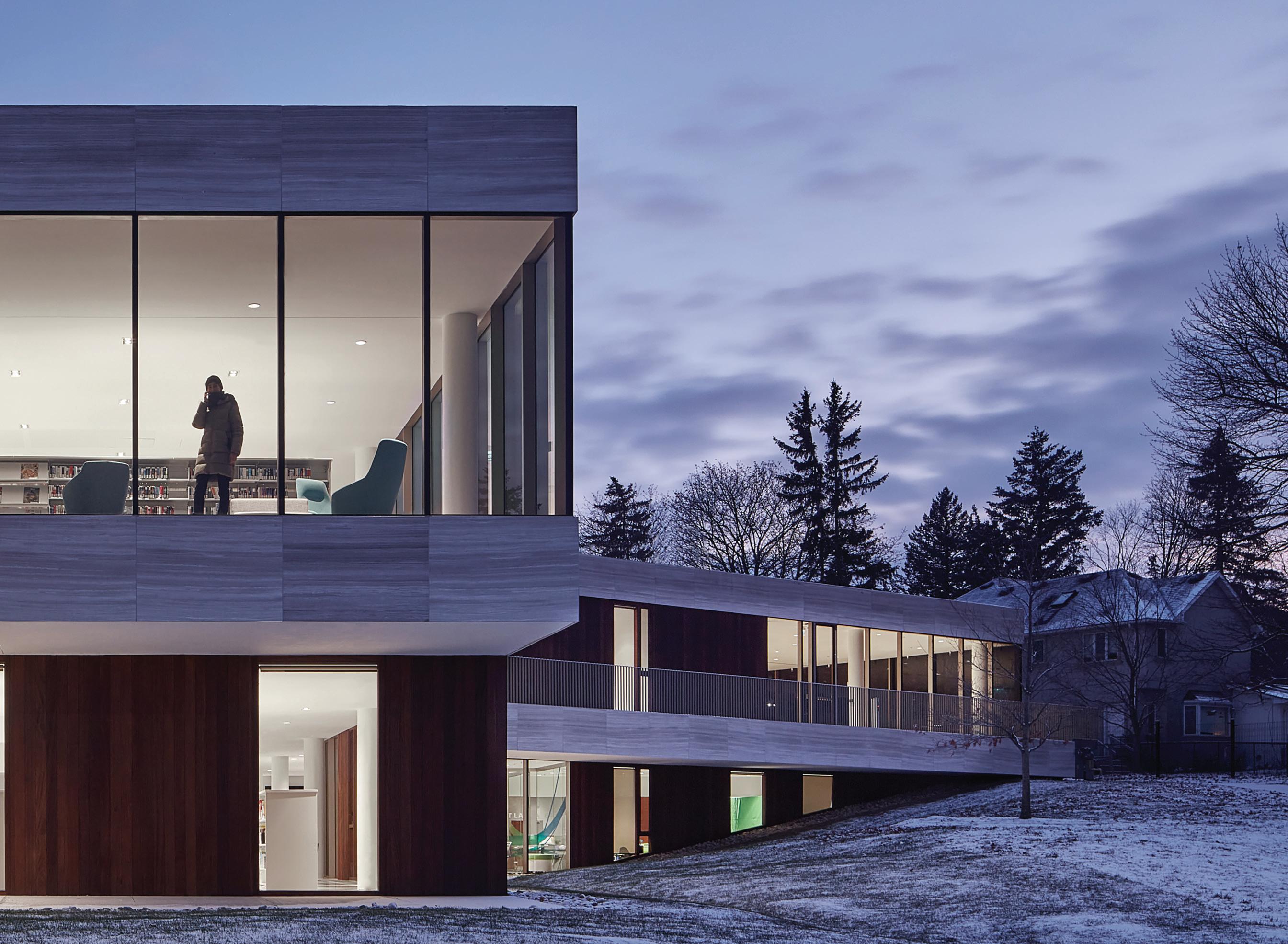 CLIENT COMMISSION SCOLAIRE DES RIVES DU SAGUENAY | ARCHITECT TEAM STÉPHAN GILBERT (BGLA), KIM PARISEAU (APPAREIL ARCHITECTURE), ÉTIENNE BERNIER (AGENCE SPATIALE), LYDIA LAVOIE (BGLA), MARC-OLIVIER CHAMPAGNE-THOMAS (APPAREIL ARCHITECTURE), JOHANIE BOIVIN (PREVIOUSLY WITH AGENCE SPATIALE), JÉRÔME DUVAL (AGENCE SPATIALE), PASCAL DROLET (BGLA) | CONTRACTOR AMEC CONSTRUCTION INC. | ENGINEERS LGT (NOW WSP | LANDSCAPE COLLECTIF ESCARGO + ROUSSEAU LEFEBVRE ENVIRONMENT/SUSTAINABILITY MARTIN ROY & ASSOCIÉS | MEP PRO-SAG MECHANICAL INC | ARTIST MATHIEU VALADE AREA 3,577 M2 | BUDGET $16.75 M