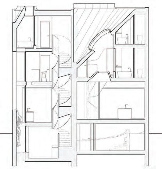 floor’s covered terrace and a roof deck topped with a perforated screen. These off-setting “bites” out of the cylindrical form create a dynamic composition that responds to the landscape, framing views and creating sheltered microclimates.