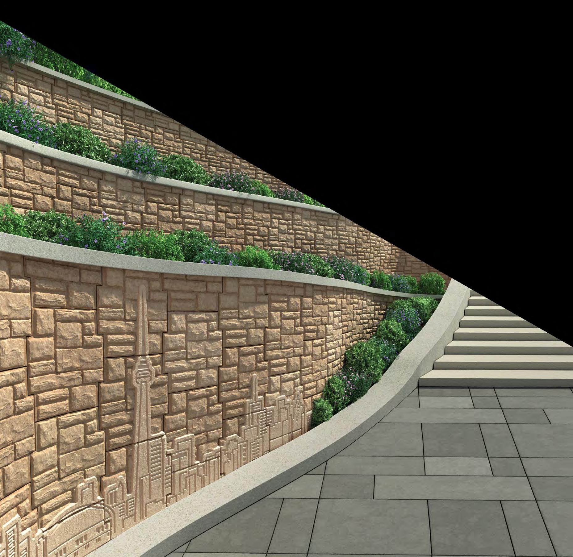 Between the generator building and the signal tower, a concrete retaining wall is detailed with equal care: a curve at the base recalls the signal tower’s round-topped windows and gently curved roof lines, and a planter at the top will allow for ivy to cascade down its surface.