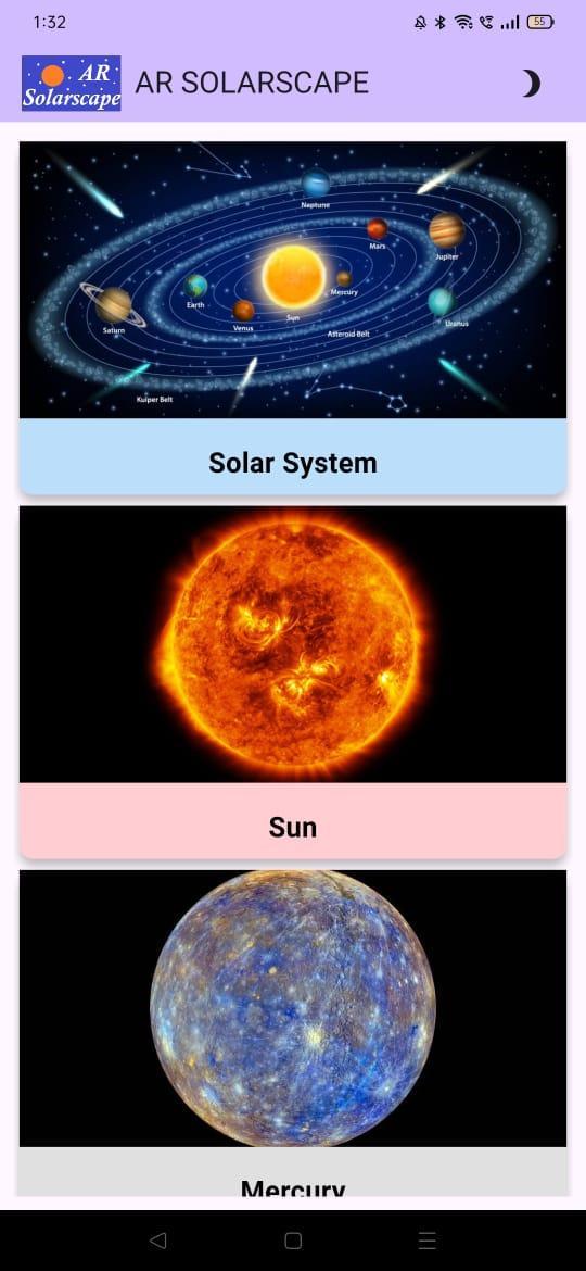 TheAppsectionpresentsastructuredlayoutwithimagesand labels for different celestial objects. The Solar System section displays a complete diagram of planetary orbits around the Sun. Below that, individual celestial bodies such as the Sun , Mercury, Venus, etc. have dedicated sections, each accompaniedbyhigh-qualityimagesandlabeledbuttons.This designsuggeststhattappingonthesesectionsprovidesusers with detailed information, AR interactions, or educational contentabouteachplanetorstar.