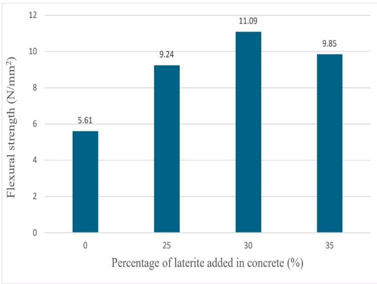 The flexural strength of fine aggregate replaced with laterite in concrete increases consistent with the addition of laterite, peaking at 30% content. With 25% laterite, strength increased by 64.7% compared to conventional concrete. At 30%, the increase was 97.68%. At 35% laterite content, 11.04% flexural strength decreases compared with 30%. This improvement underscores the laterite content in concrete matrix, with the highest enhancementat30%content.