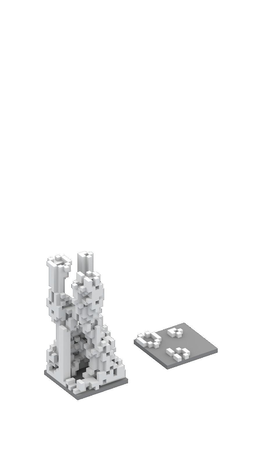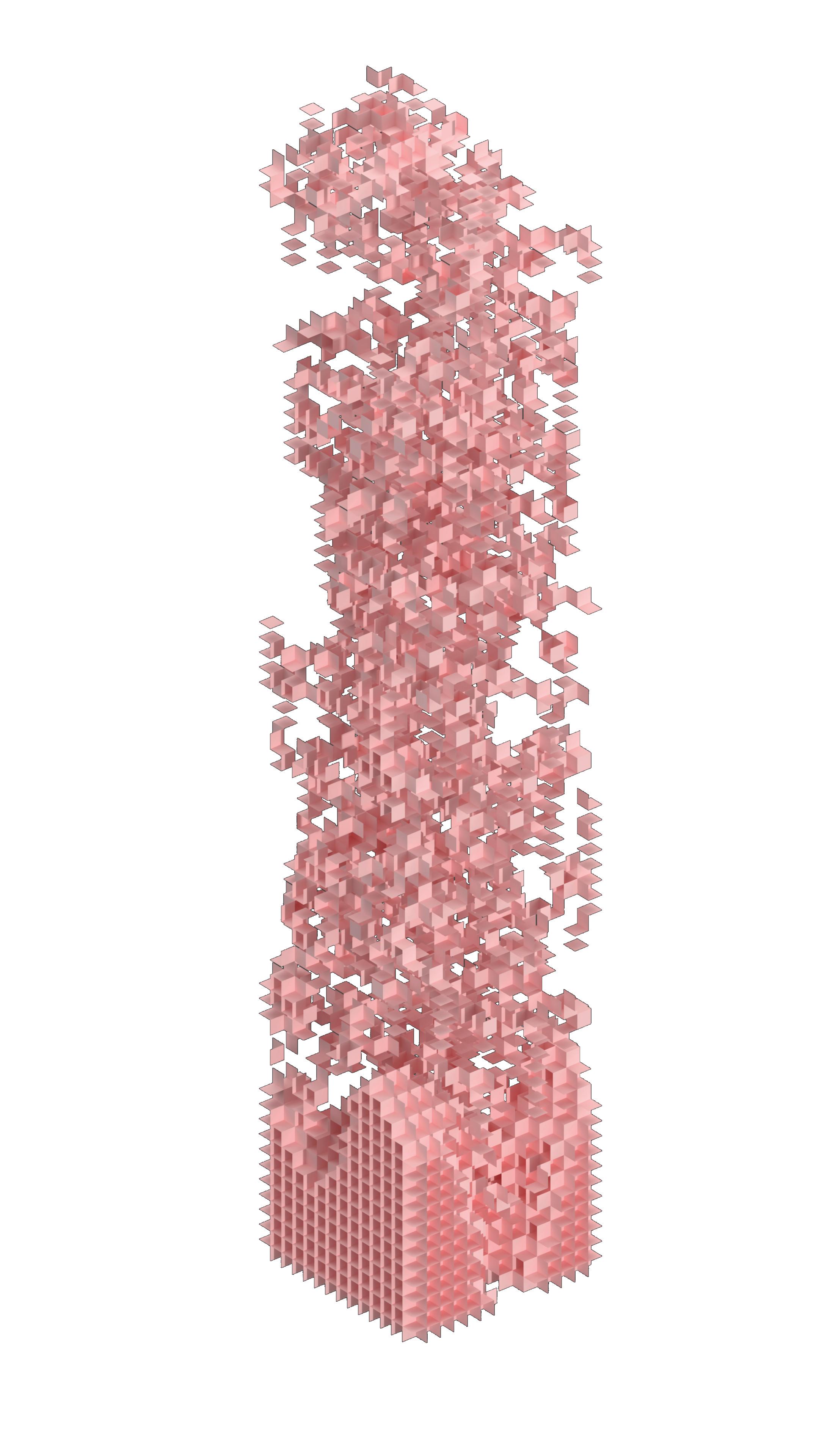 Consequently, it became crucial to subject each form to two distinct contiguity tests. The initial test would eliminate cubes that are only attached to the rest of the structure through their edges, as these components risk detachment. The second test would identify all tangent faces of the cubes and remove them completely to ensure the creation of waterproof and sealed forms suitable for 3D printing.