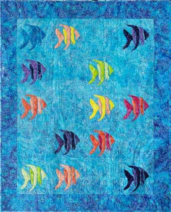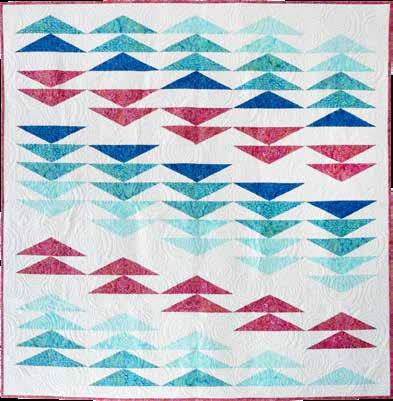 “Morning Commute dives into the serene and bustling underwater world, featuring graceful jellyfish, vibrant fish, and a majestic shark gliding through the currents. Inspired by the dynamic rhythm of ocean life, all framed by the precision of flying geese accents. This unique pairing of techniques offers quilters an engaging project that blends modern appliqué details with classic piecing.”