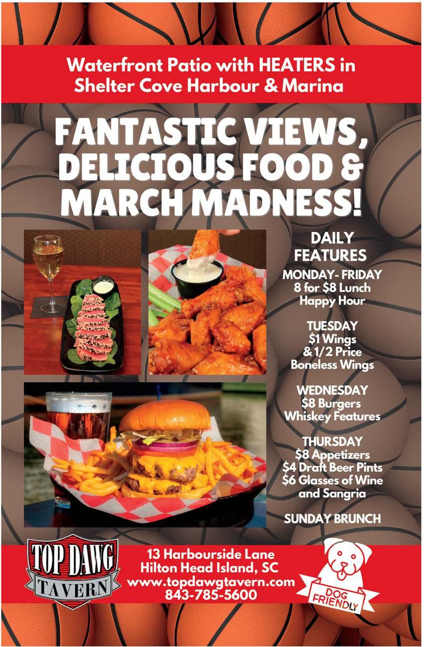 Shelter Cove Harbour & Marina. H-26 on map. GPS: 13 Harbourside Ln. Are you looking for that perfect place to grab a bite to eat or have a drink while visiting with friends and family? Top Dawg Tavern is the place for you! They serve fresh, quality food with a smile. Come hang out on the outdoor patio and enjoy a full selection of local craft beers. There are plenty of TVs to catch your favorite team, including a jumbo projection screen. See ad page 64. (843) 785-5600
