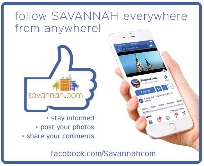 Savannah Scene® prints a minimum of 280,000 copies per year and is distributed to approximately 300 locations in Savannah and surrounding areas. Subscriptions are available at $24.00 (Canada, $30 US) per year, single copies at $5 for postage and handling (Canada, $6.00 US). Send check to Island Communications, P.O. Box 5511, Hilton Head Island, SC 299385511. The design, concept and contents of Savannah Scene® are copyrighted and may not in any manner be reproduced in part or whole without written permission from the publisher. Every effort is made to provide dependable information; however, the publisher does not warrant that the content herein is complete or accurate. Any rates, special offers, etc. are subject to change and are not guaranteed by Island Communications.