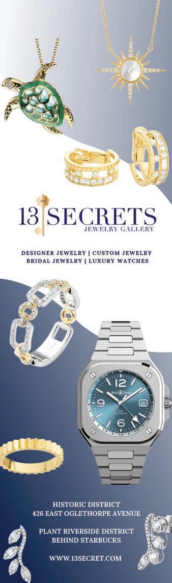 That’s not all! Also in this issue are guides for Savannah’s Historic Squares and even maps of Savannah proper and the Downtown Savannah Historic District. Flip the page for our hand-selected lists for dining, shopping and entertainment and our Calendar of Events. You’ll find our July and August horoscopes, coupons for dining and entertainment, your bespoke Savannah Scene (Crossword) Puzzle, a chart for Savannah area tides and even suggestions for her best photo spots.