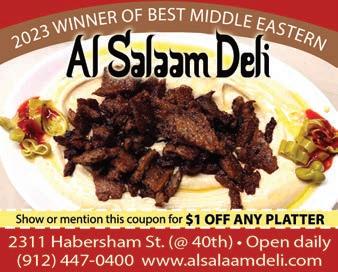 2311 Habersham St., R-8 on map. Nestled in the heart of Midtown Savannah,Al Salaam Deli has been voted Best Middle Eastern Restaurant every year since 2010! Treat yourself to fresh, made-to-order Middle Eastern delicacies, such as delicious falafel, gyros, fatoush and hummus, as well as baba ganoush.The menu also includes hamburgers, chicken gyros and salads. The owners put love and care into the preparation of their dishes and are proud to share their rich culinary traditions. Open Mon.Sat., 11 a.m.-7 p.m. See ad page 13.