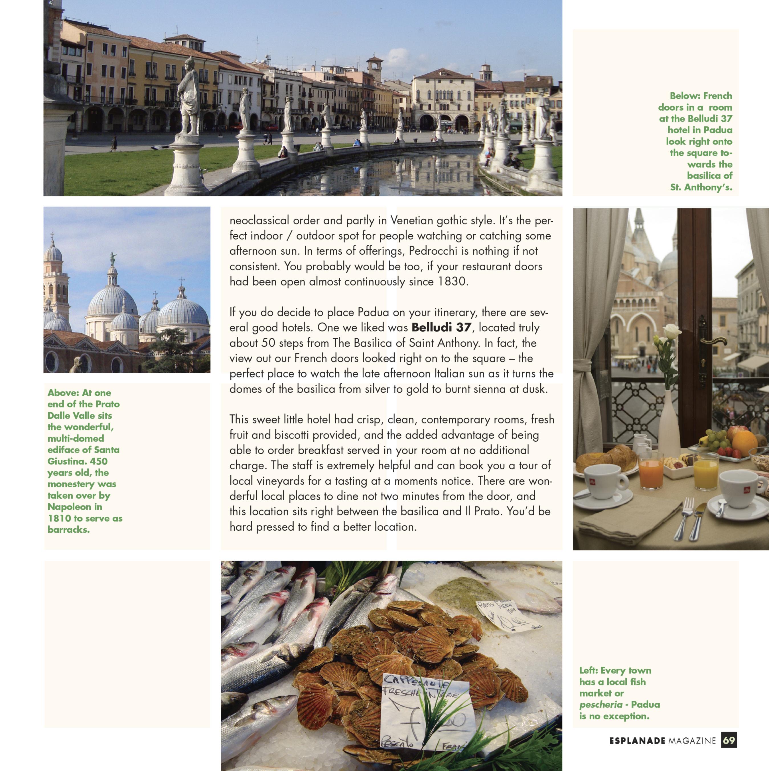Tucked in the Veneto region of Italy, 90 minutes from Milan in one direction and 35 minutes from Venice in the other, Padua, or Padova in the Italian spelling, is a compelling one or two day side trip from almost any Italian city With a histor y that stretches back to antiquity, this town has a lot going for it in spring or summer months: no crowds, wonder ful architecture and ar t and hotels less than half of what you might pay in one of the larger cities. But what makes a visit compelling is the stylistically diverse little city that has developed over hundreds of years as seen through its monuments and daily life