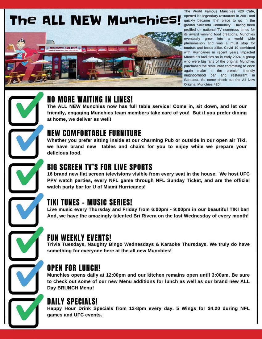 Gulf Gate Food + Beer (S-51): Sarasota’s late-night hot spot for the service industry, night owls, and midnight snackers. It’s not your typical sports bar, offering unique menu selections for carnivores and vegetarians. Be sure to check out their menu online at: eatfooddrinkbeer.com. Hours: 11 a.m. – 1 a.m. (Sun. - Thurs.) open until 2 a.m. (Fri & Sat.).