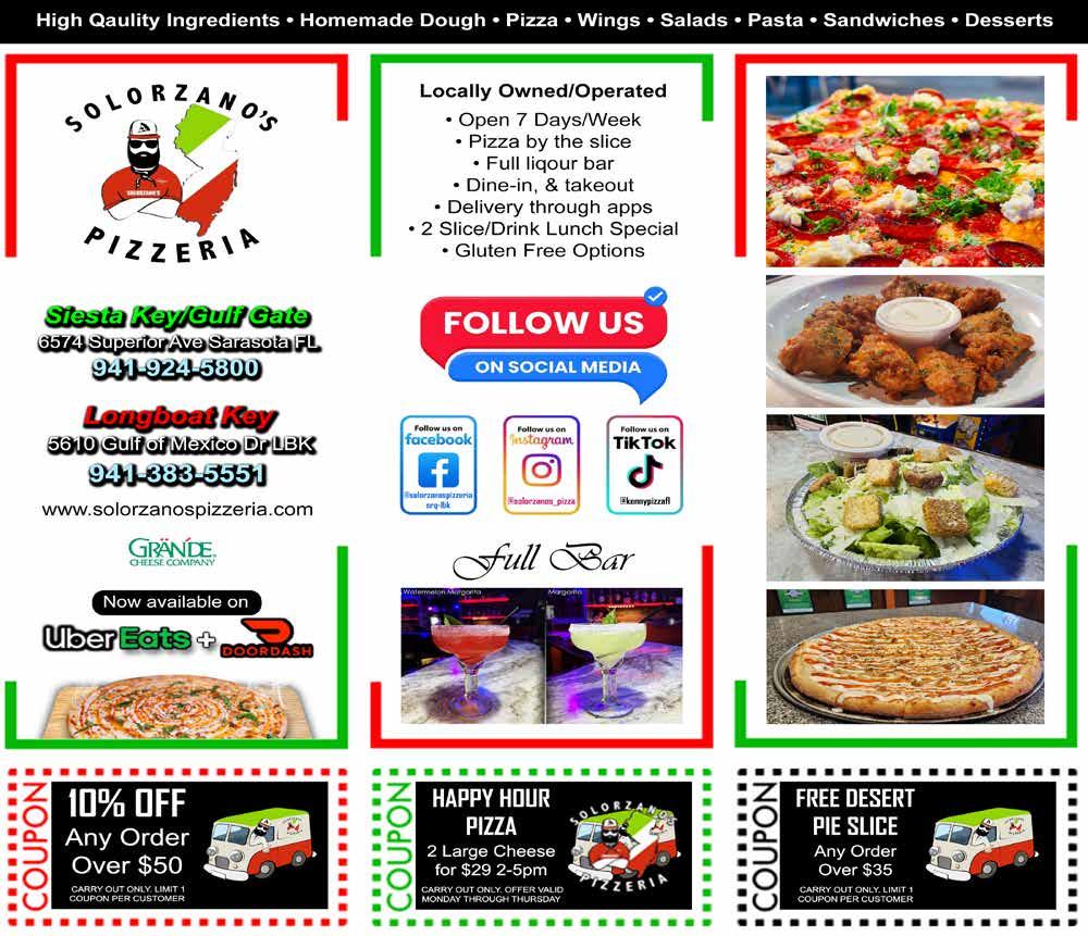 Solórzano’s Late Night Pizzeria (S-34): At every Solórzano’s, they offer an experience familiar to those who understand the importance of family and dedication. Their recipes and techniques have been perfected through three long generations based on the traditional simplicity of the methods used by their Italian ancestors. Dine