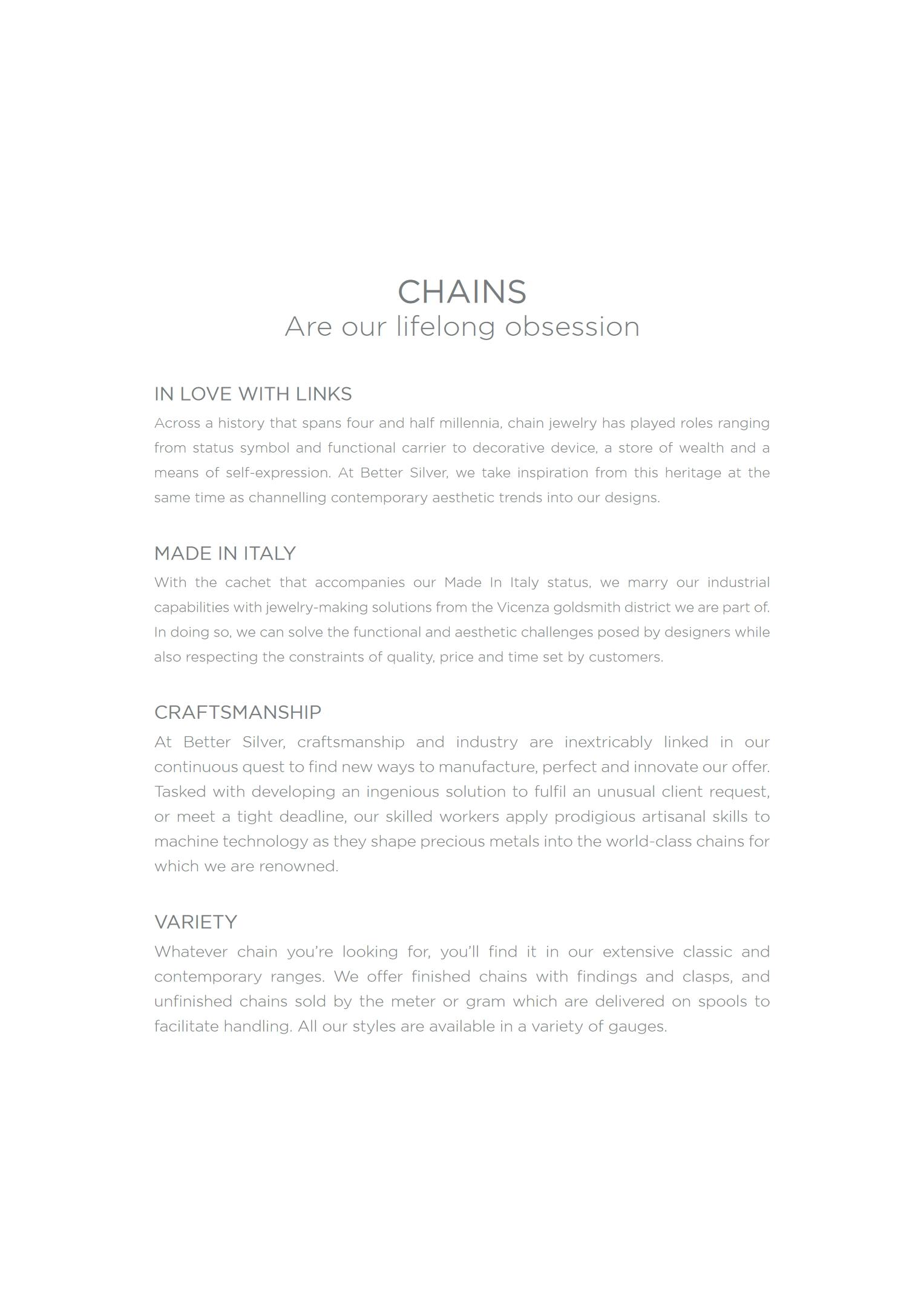63 FLL ZGT TB A FORZATINA LUNGA RITORTA C/CHIUSURA T-BAR. Page 64 FLL ZGT TB KAW FORZATINA LUNGA RITORTA C/CHIUSURA T-BAR. Page 64 FLL ZGT TB KRAW FORZATINA LUNGA RITORTA C/CHIUSURA T-BAR. Page 65 OR FC2B OR.CON FORZATINA LUC.E 2 CZ BIANCHI INSERTI Page 65 OR FC2V OR.CON FORZATINA LUC.E 2 CZ VERDI INSERTI Page 66 OR FLL OR.3 MAGLIE FORZ.LUNGA Page 66 OR GBL OR.C/ LUCCHETTO MEDIO A LOBO Page 66 OR LUP K OR CREOLA C/LUCCHETTO MEDIO LUCIDO Page 62 OR YFL OR CON TRE MAGLIE LUNGHE LUCIDE Page 62 OR YFZG K OR.C/FORZATINA LUNGA LUC.+M.F. AVVOLTO PEND. Page 63 RMT B004 K BR.RMT CON RLL INSERTE Page 64 RMT N004 K COLL.RMT CON RLL INSERTE Page 65 TNQTZRBI BR FZ10 BR.TENNIS E FLL ZGT Ø100 Page 65 TNSOZRBI BR FZ10 BR.TENNIS E FLL ZGT Ø100 Page MULTI CHAINS 70 BEAD 3FBR3SP BR. BEAD 3 FILE CON SPESSORI DIVERSI Page 70 BEAD 3FSC3SP BEAD A 3 FILE SCALARI IN 3 SPESSORI DIVERSI Page 70 BEAD 8L002FSCN033 K COLL.A DUE FILE SCALARI CON BEAD 8 LATI E CORDA LASER Page 70 BEAD D2612F GR BEAD DIAM.D261 + GRUMETTA 060 Page 71 BEAD D2612FBRGR BR 2 FILE BEAD D261 + G060 Page 71 BEAD1+1 4LQ 4FTB 4 BEAD 1+1 DIAM.4LQ A 4 FILE C/T-BAR E "Y" Page 71 BEAD1+1 4LQ BR 4FTB 4 BR.BEAD 1+1 DIAM.4LQ A 4 FILE C/T-BAR E "Y" Page 74 BEADPC 2F B002 BR.BEAD A PASSO CORTO E CUBE Ø200 A 2 FILE PARI Page 74 BEADPC 2FSCN002 COLL.BEAD A PASSO CORTO E CUBE Ø200 A 2 FILE SCALARI Page 67 CRD LS 2FSCN007 COLL.CORDA LASER A 2 FILE SCALARI Page 68 FLL B 2FSCN035 K COLL.A 2 FILE SCALARI CON FLL B E ALTERNATA 3+1 DIAM.2 LATI Page 69 FLL B 2FSCN060 K COLL.A 2 FILE SCALARI FLL B (080 e 060) Page 69 FLL B 3F K BR.FORZATINA LUNGA BRILLANTATA A TRE FILE Page 69 FLL B 3FSCN010 K FORZATINA LUNGA BRILLANTATA A TRE FILE SCALARI Page 69 G 2FSCN011 K COLL.A 2 FILE CON GRUMETTA E R 3+2 XB25 Page 71 G 3F B005 BR.A TRE FILE CON GRUMETTA,BEAD PC E G FS8L Page 72 G 3FSCN005 COLL.A TRE FILE SCALARI CON GRUMETTA,BEAD PC E G FS8L Page 72 G FS 2FSCN034 COLL.2 FILE SCALARI GRUMETTA CON FASCETTE E FLL Page 75 MSM7 4 MULTISTRADS MIX (7 STRADS) Page 67 R XL002F XC58 BR.A 2 FILE DI FORZATINA DIAM."X"C/CHIPS 5X8 LUCIDE Page 67 R XL002FSCXC58 COLL.A 2 FILE SCALARI DI FORZATINA DIAM."X"C/CHIPS 5X8 LUCIDE Page 67 R B 4L01XC B013 BR.FORZ.BRILL.C/CUBI DIAM.2 FILE C/CAST.QUADRO PENDENTE Page 68 R B 4L01XC N013 COLL.FORZ.BRILL.C/CUBI DIAM.2 FILE SCAL.C/DOPPIO CAST.QUADRO Page 68 RIQ BT 3F B001 K BR.ROLO'C/INSERTO QUADRO BRILL.A TRE FILE PARI Page 68 RIQ BT 3FSCN001 K COLL.ROLO'C/INSERTO QUADRO BRILL.A TRE FILE SCALARI Page 72 RTG 2F B075 BR.CON ROLO'BRILL.A DUE FILE E CHIUSURA AD INFINITO Page 72 RTG 2F N075 CO.CON ROLO'BRILL.A DUE FILE E CHIUSURA AD INFINITO Page 73 RTG 3F B003 BR.ROLO'TINDA BRILL.A 3 FILE PARI Page 73 RTG 3F B009 BR.ROLO'TONDA BRILL.A TRE FILE E MISURE Page 73 RTG 3F B048 BR.RTG A TRE FILE PARI CON MOSCHETTONE TONDO LUCIDO Page 73 RTG 3F N003 COLL.ROLO'TINDA BRILL.A 3 FILE PARI Page 74 RTG 3F N048 COLL.RTG A TRE FILE PARI CON MOSCHETTONE TONDO LUCIDO Page 74 RTG 3FSCN009 COLL.ROLO'TONDA BRILL.A TRE FILE E MISURE SCALARI Page LINKS 77 GR B 2L00 CS GOURMETTA RADA DIAM. 2/LATI C/CHIUS.SPAGNOLA Page 76 R AMAG FORZATINA C/CHIUSURA MICROFUSA Page 76 R AMAG K FORZATINA C/CHIUSURA MICROFUSA Page 76 RHT CM ROLO' A CUORE CON CHIUSURA MICROFUSA Page 76 RHT CM K ROLO' A CUORE CON CHIUSURA MICROFUSA Page 77 RMT OV CM ROLO' M/T OVALE CON CHIUSURA MICROFUSA Page 77 RMT OV CM K ROLO' M/T OVALE CON CHIUSURA MICROFUSA Page 77 VDL MT CM VEN.MEZZO TONDO LUNGA C/CHIUSURA MICROF. Page ARIA 81 BEAD 8L00 Y4SR FANCY BEAD CHAIN 8 S.D.C. Page 82 BEADPC OR12 OR.CREOLA C/BEAD PC DA 12MM Page 82 BEADPC OR26 OR.CREOLA C/CANNA SAG.A PALLINE DA 26MM Page 82 BEADPC OR33 OR.CREOLA C/BEAD PC DA 33MM Page 83 BEADPC OR46 OR.CREOLA C/BEAD PC DA 46MM Page 83 BRP2S PL BR.SCH.CONTRARIE'C/PALL.SPIGA E PALL.LUC.FINALI Page 83 OL/4 COLL.-BR.C/OVALINE LUCIDE INFILATE Page 84 OL/D241 COLL./BR.INFILATO C/OVALINE DIAM.D241 Page 150
