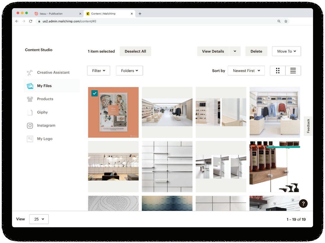 You can connect your Issuu account with Mailchimp and instantly create and export GIFs and Social Posts to the Mailchimp Content Studio. Embed these assets in your email campaigns. Link your emails to a fullscreen reader experience of your Issuu publications.