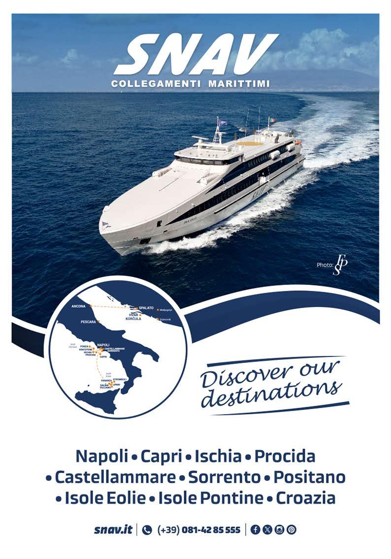 a f l e e t m o d e r n i z a t i o n p r ogramme with the introduction in June of the first HSC of the Sirius series, an enhancement that will continue in the coming months with the arrival of a sister unit These investments have been made with the aim o f p r o v i d i n g a n i n c r e a s i n g l y high-quality service and reducing the environmental impact that vessels have on both the sea and the land SNAV will focus on new lines on both short and long-haul services, opening 2025 bookings in October and presenting SNAV’s innovations aimed at the trade Summer 2024 closed with a substantially positive balance The lines that operated in the Gulf of Naples to the Aeolian