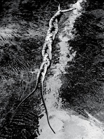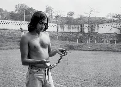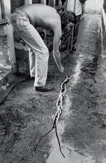 Tunga holding snakes that are part of A Vanguarda Viperina, 1985, at Instituto Vital Brasil, in Niterói, Rio de Janeiro.