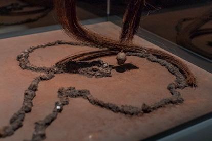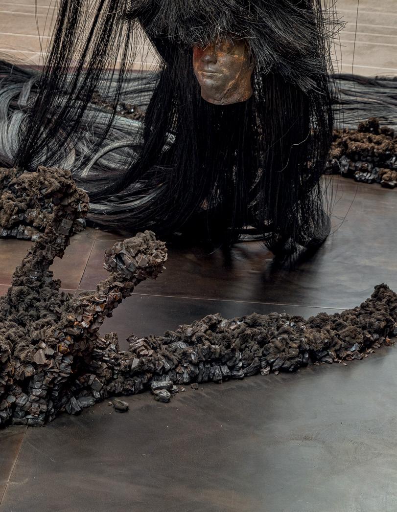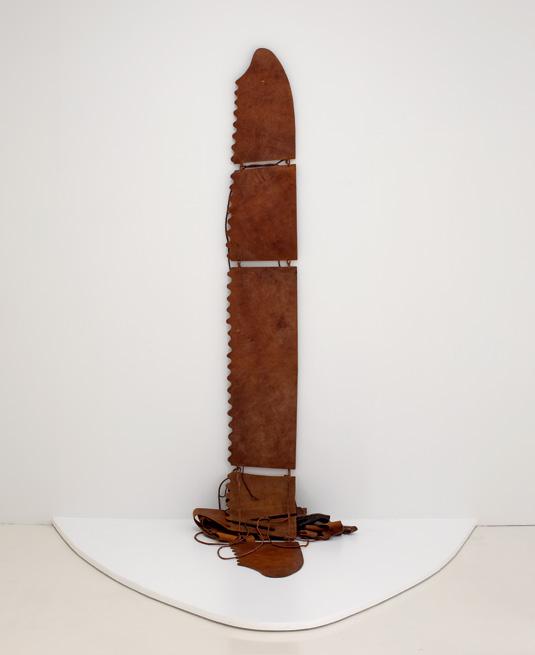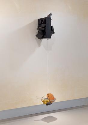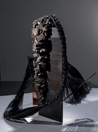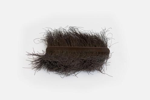 Já Troféu (1981) (p. 120 | img. 108), enorme cabeleira, assume, pela dimen são, a condição de objeto de sacrifício, subjugação e veneração, significados possíveis que as tranças encerram. Despojo de um corte que tantas vezes vai reaparecer no trabalho de Tunga como um gesto material e simbólico de uma separação radical e irremediá vel – e também a ser rearticulada. O corte dá origem a algo que é parte e se soma ao todo e, se ele se refere à decapitação, invoca o desígnio de um santo que lhe dá o nome: São João Batista (2 a.C.-27). Uma parte no chão, outra na parede, como uma espécie de troféu à vista de todos; a