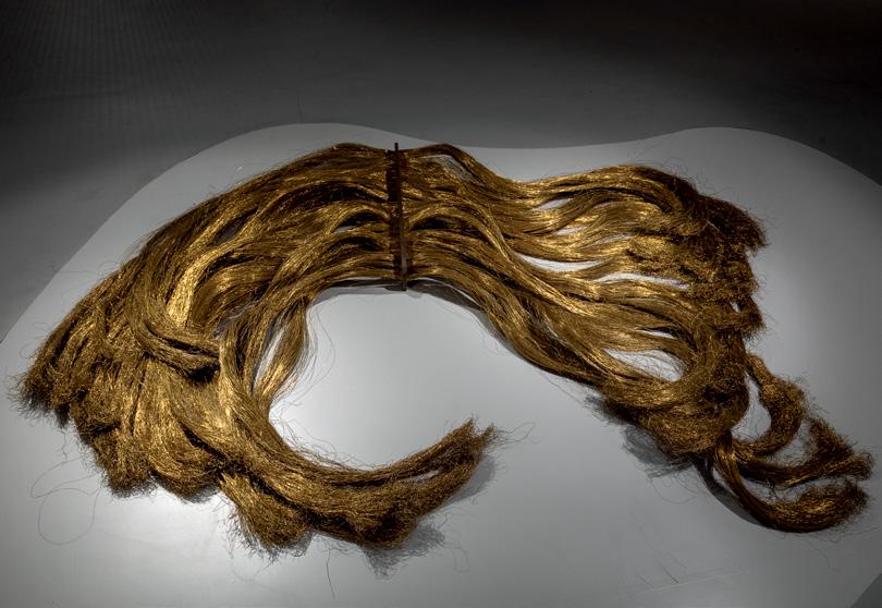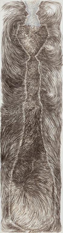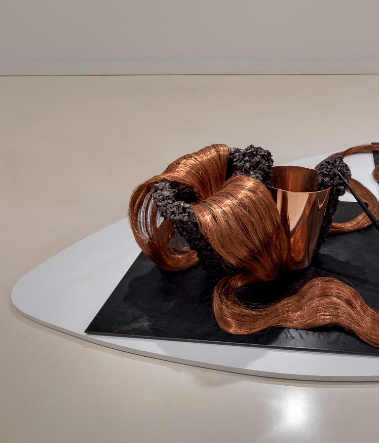 Fixações peculiares vão estabelecer uma família de fetiches; cabelos, por exemplo, são um dos mais notáveis. Ao torná-los matéria escultórica, o que em certa medida já o são poten cialmente, o trabalho entrelaça, como sempre, corpo e escultura. Portanto, as gêmeas xifópagas só poderiam estar unidas pelos cabelos, sendo os fios os condutores da “energia de conjunção” que as envolve numa atmosfera lírica, musical, encantatória, tal uma mesma melodia repetida e repetida. Uma ode à puberdade, pois se supõe que só nessa idade os cabelos manifestam sua pura sensualidade nascente. E aí o “x”, a incógnita, é um palíndromo capilar: