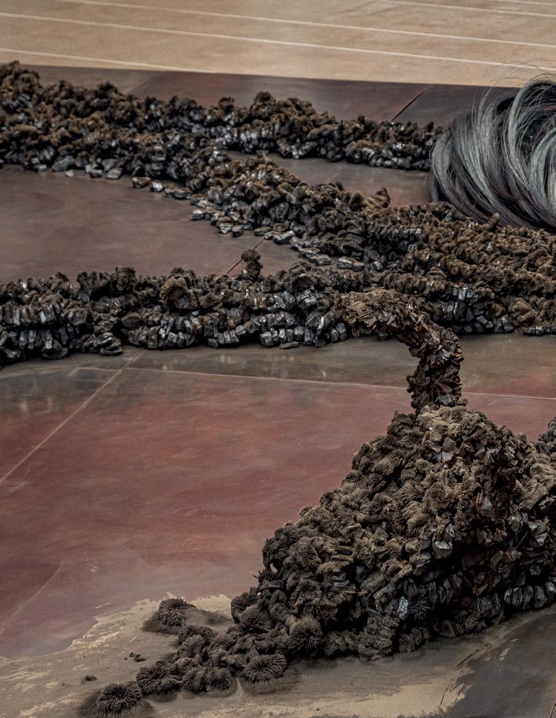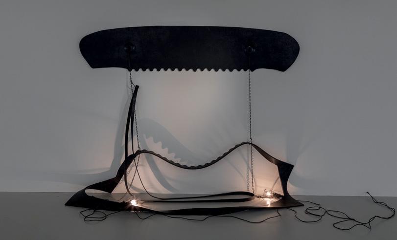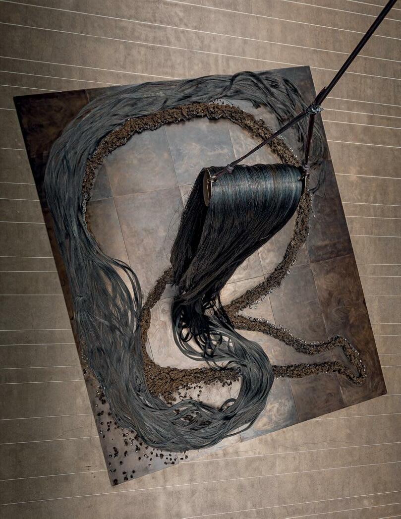 Tunga faz o ateliê se transmutar em laboratório; um e outro contaminam-se, experimentando e sedimentando a volatilidade dos impulsos e das ideias. Nele a figura topológica do toro pode ser tanto um objeto de metal, um túnel, como um círculo de fumaça expirada de um cigarro. E a infini tude da circularidade em Ão (1981) é também o infinito entrelaçamento de uma trança escultórica e verticali zada modernamente por Constantin Brâncusi (1876-1957) na sua Coluna infinita (1937). Já o desejo de Tunga é incorporar à Trança a sinuosidade orgânica e corpórea da serpente e estendê-la como algo simplesmente jogado ao chão, o oposto de Lezart (1989), vertical, sua primeira grande escultura de ímãs.