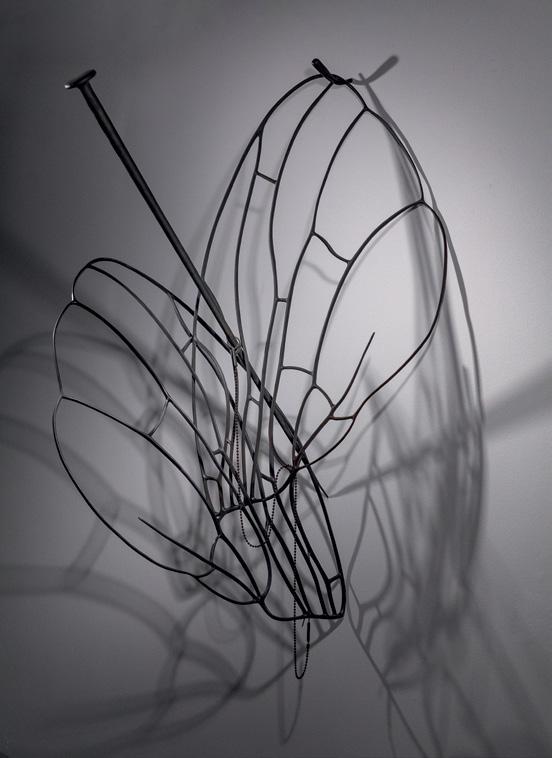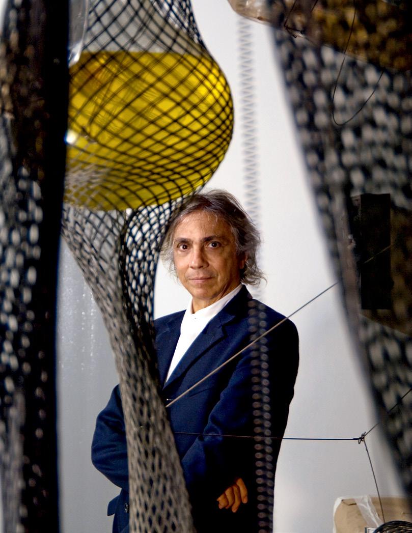 Uma escultura metálica, mas flexível, sinuosa, muitas vezes amarrada – num toque final – com um irônico, gracioso e perverso laço de seda colorido.