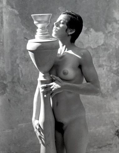 A Vênus que surge pela primeira vez na pré-história do trabalho de Tunga tinha que ser pré-histórica: a Vênus de Laussel , estatueta paleolítica desco berta na França em 1909, aparece na fotografia que faz parte de uma obra, hoje perdida, Piscina (1975), publicada na revista Malasartes junto com o texto “Prática de Claridade sobre o Nu”. Nota-se que essa Vênus já é o “nu”, um dos primeiros da história. A Vênus vai se tornar Vê-Nus (1976); ao separar e ligar a sua nudez ao voyeur por um hífen, Tunga indica que sem um não há o outro. Algo semelhante ocorre com os Eixos Exógenos . Eixos x Exógenos – o “x” que se repete nas duas palavras é como a representação gráfica de um eixo –, há uma proximidade entre esses termos, um está ligado ao outro, umbi licalmente, como as Xifópagas Capilares entre Nós (1984), por um “x”, incógnita que nos fascina e desconhecemos. Cariátides contemporâneas – assim poderíamos denominar os Exógenos, corpos eretos e hieráticos gerados pela circunvolução de um corpo de mulher em torno de um eixo; o “x” que lhe dá corpo ao se retirar quando a ausência se torna presença. Portanto, cariátides negativas; simultaneamente clássicas e contemporâneas. Essa volubilidade do imaginário da obra leva o corpo às intermináveis aventuras da forma; aliás, aqui, forma deve ser compreen dida apenas como um estágio, um momento de passagem que se presen tifica em um e noutro trabalho. Forma é um fluido entre mental e material, ideado e materializado, portanto indis tinto, uno; a “substância” da poética. Ora é a corporificação de uma expe riência planar, como nos Albinos , ora o corpo se materializa como “vazio”