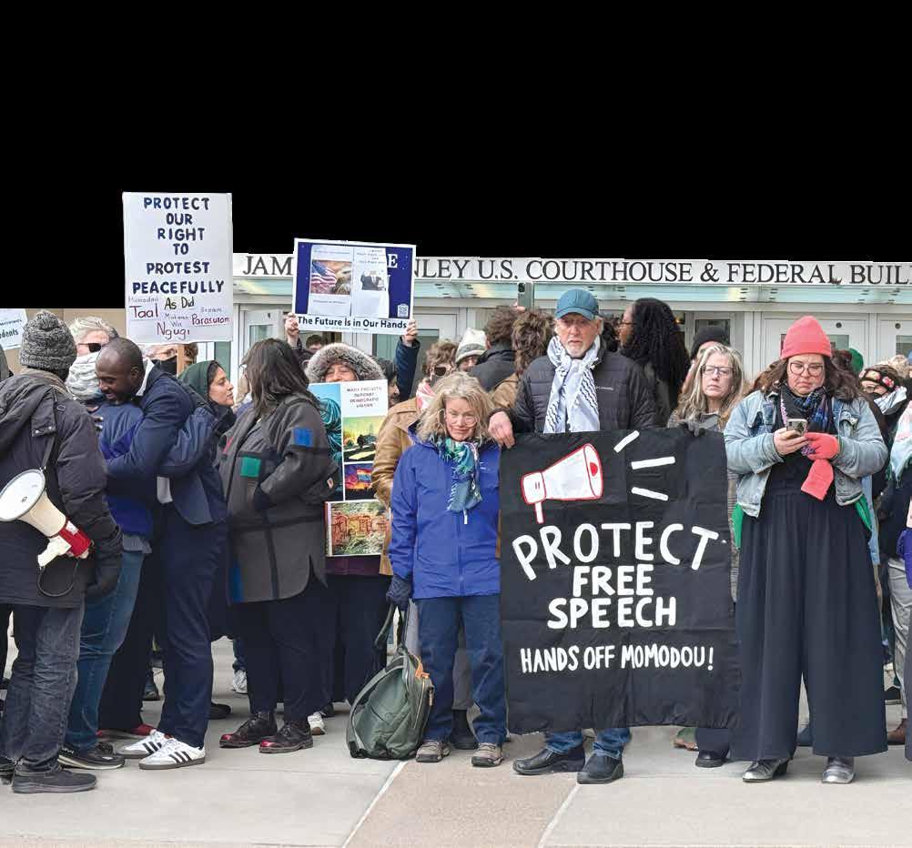 More than 100 people gathered outside the James Hanley Federal Building in Syracuse on Tuesday, March 25, to hear updates from Momodou Taal’s legal team following their trial on a lawsuit that seeks to nullify two executive orders from the Trump administration that violate free speech.