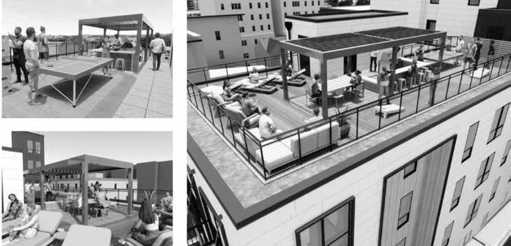 Architect Noah Demarest said the rooftop’s large amenity space will have an activity zone for games like table tennis and cornhole, a bar and grill area with a pergola for outdoor dining, and a lounge space. The perimeter will be lined with a railing and natural sedum plants. For safety and security, the space will have security cameras and ample lighting, including pendant lights under the pergola and continuous lighting along railings and near doorways.