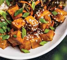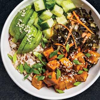 zepłucz kilkukrotnie w zimnej wodzie, następnie gotuj 12-15 minut (w zależności od rodzaju ryżu) w 2 szklankach dy. Odstaw pod przykryciem na kolejne 10 minut. okrój w kostkę, odciśnij nadmiar wody w ręcznik papieromisce wymieszaj sos sojowy, syrop klonowy, olej sezamowy, bir. Włóż pokrojone tofu, wymieszaj i marynuj um 15 minut, następnie podsmaż na patelni na złoty kolor. o przekrój, obierz i pokrój w cienkie plasterki, kostkę, marchewkę - w cienkie paski. Liście nori potnij
