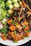 miski włóż porcję ryżu. Ułóż obok awokado, ogórka, ewkę, nori i tofu. Posyp sezamem i szczypiorkiem