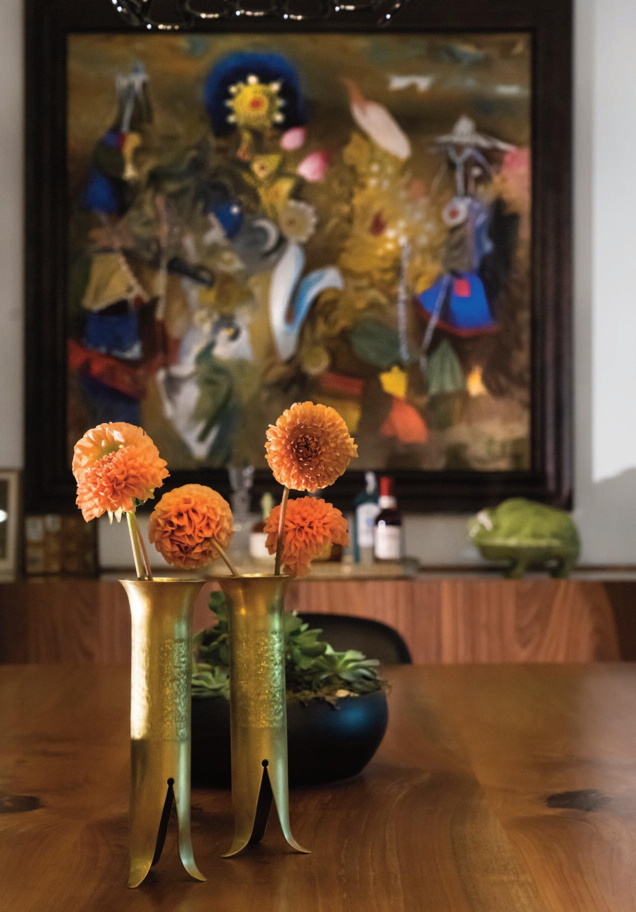 The furnishings and finishes in the common spaces are distinguished by light and neutral colors that complement the owners' collection of artworks, while the kitchen is characterized by contrastingly darker tones.
