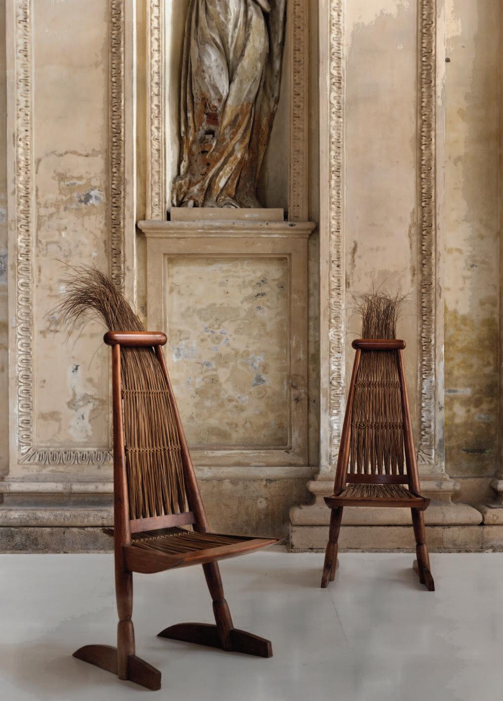 Right: pair of chairs by Joaquim Tenreiro, 1970s. Straw and teak. (photo: Fausto Mazza Studio)