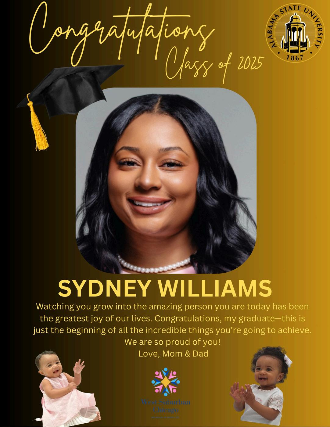 ydney Williams is the daughter of Andrea and Michael Williams, II. She attends olingbrook High School in Bolingbrook, Illinois. She has been a member of the West uburban Chicago chapter of Jack and Jill for 10 years. She currently serves as Recording ecretary. She also has served as Parliamentarian and Corresponding Secretary. She has een an Honors & AP student for 4 years. She is involved in the following community and eadership roles: National Honor Society member, BHS Peer Mediator, BHS Student Advisory school and Senior Representative, BHS Soccer Manager, Extended Hands and eet. She plans to attend Alabama State University where she will major in Biology to ecome a Doctor of Physical Therapy.