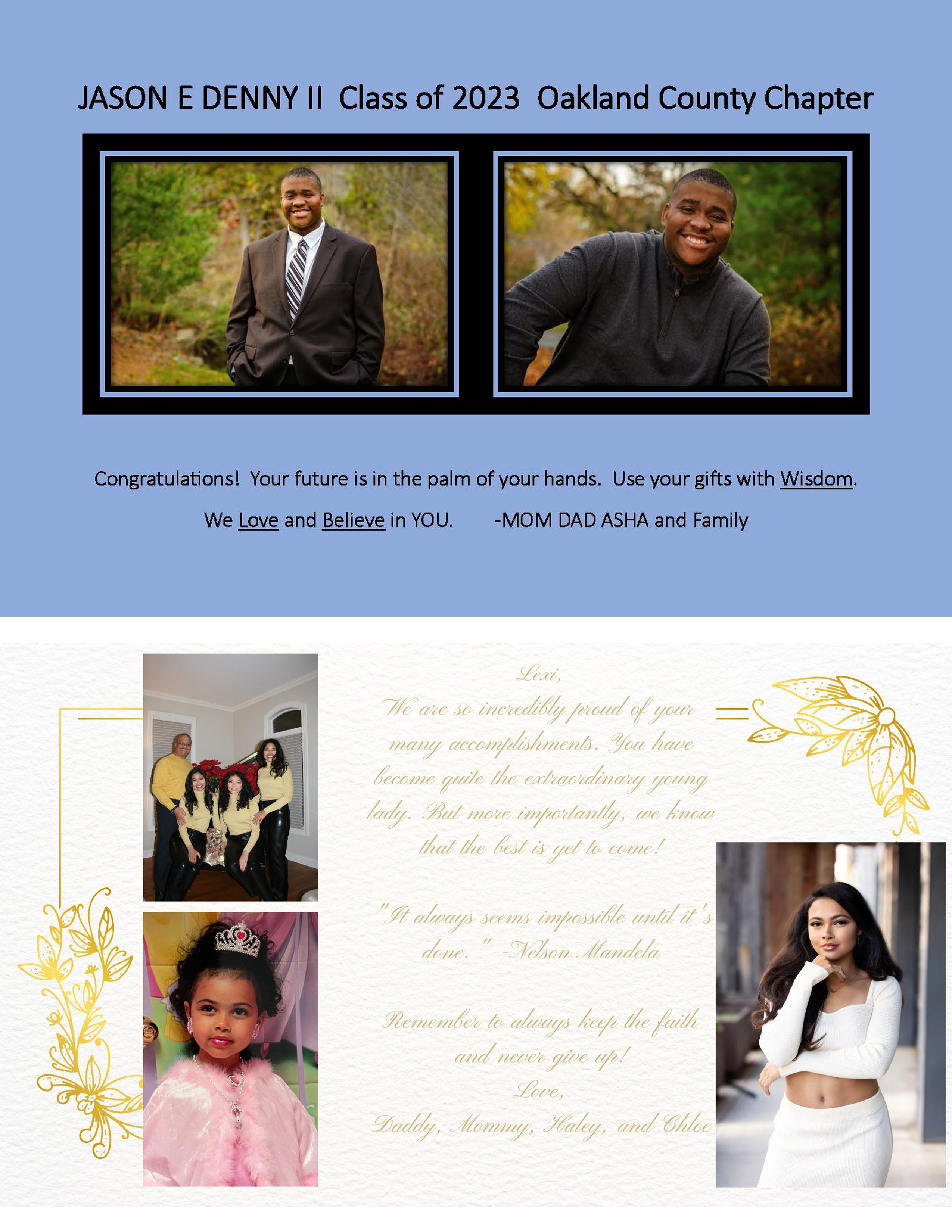 Timothy Adams Jr. is a senior at Brebeuf Jesuit College Preparatory School in Indianapolis, Indiana and is the son of Mr. Timothy Adams Sr. and Mrs. Mande Adams. He has been a member of the Circle City Chapter for ten years. He plans to attend college in the fall of 2023. With over seven years of student leadership experience, he plans to continue to lead and advocate and hopes to have a career in corporate law or investment banking.
