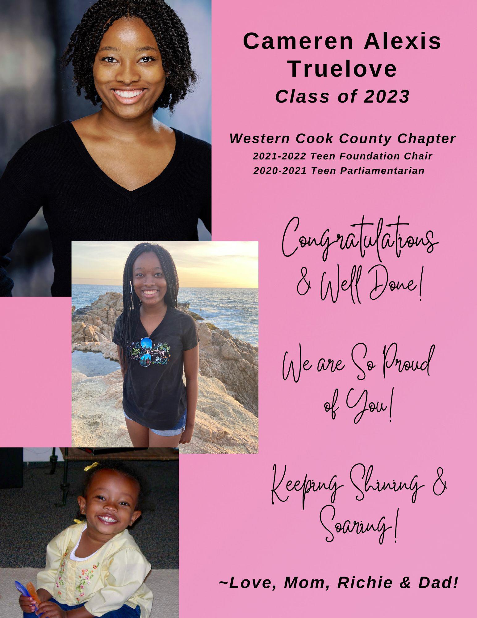 Cameren Alexis Truelove, daughter of Ms. Leslie Truelove and Mr. Richard Truelove is a senior at Oak Park and River Forest High School, in Oak Park, Il. She has been a member of the Western Cook County Chapter for ten years; and is a past Teen Parliamentarian and Foundation Chair. Cameren is a multifaceted Honor student -- awards include, Illinois State Scholar, Spanish Honor Society inductee, College Board African American Scholar, and 2023 Illinois All-State Musical cast member. She also studied Spanish in a 4-week Spanish Immersion summer program in Barcelona, Spain. Cameren enjoys singing, dancing, and performing in musicals. During her high school career, she’s sung with True Colors, an all People of Color acapella group, and with the schools Honors Chorus; she serves as Show Choir Spirit Captain; and has performed in five musicals, including the Illinois All-State performance of Shrek the Musical. She also has expanded her theater experience by serving as Production Assistant for a community theatre production. In the fall, Cameren will attend DePaul University, School of Cinematic Arts in Chicago, and will pursue a Bachelor of Arts degree in Film and Television. She intends to pursue a career in the entertainment industry.