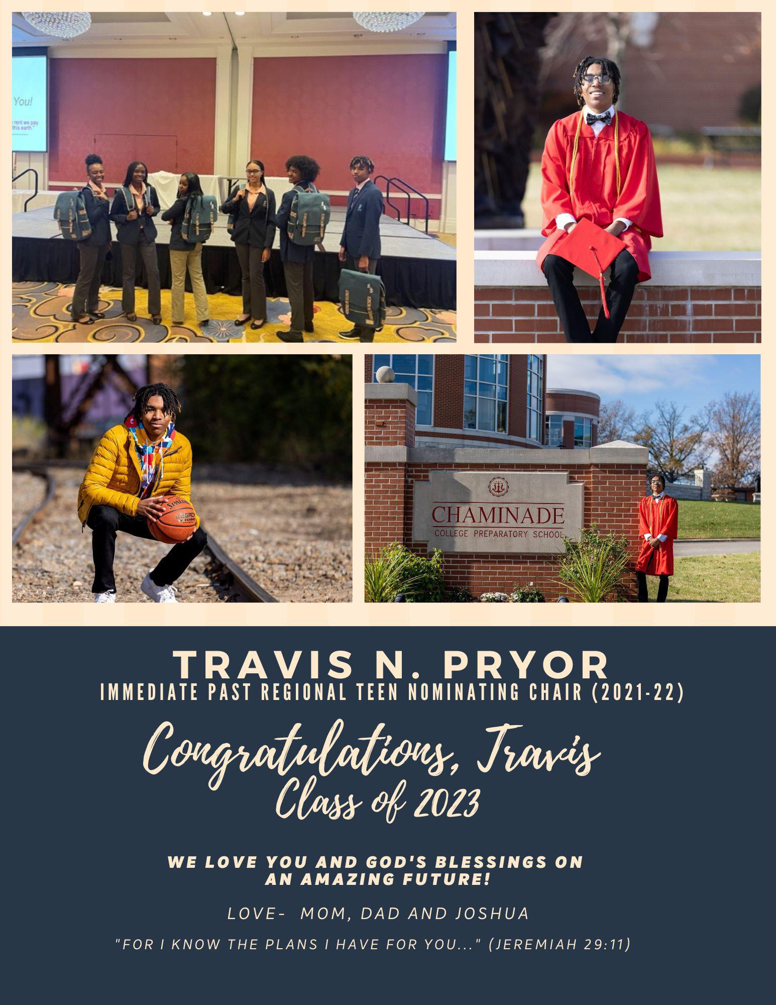 Travis N. Pryor is a senior at Chaminade College Preparatory School in St. Louis, Missouri and is the son of Dr. Seqwana and Mr. Travis Pryor. Travis has been a member of Jack and Jill of America, Inc. for fifteen years. He served as the 2021-22 Mid-Western Regional Teen Nominating Chair, Chapter Teen Parliamentarian and Sergeant-at-Arms. He is a member of the National Chinese Honor Society, NSBE Jr. National Ambassador and Teen President - St. Louis Gateway Chapter and has earned the Presidential Service Award (4) straight years. Travis plans to attend Southern Methodist University as a Hunt Leadership Scholar to pursue an undergraduate degree in Computer Science with Game Development Specialization.