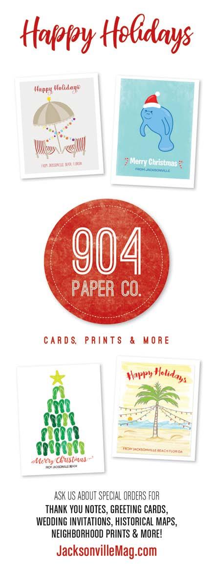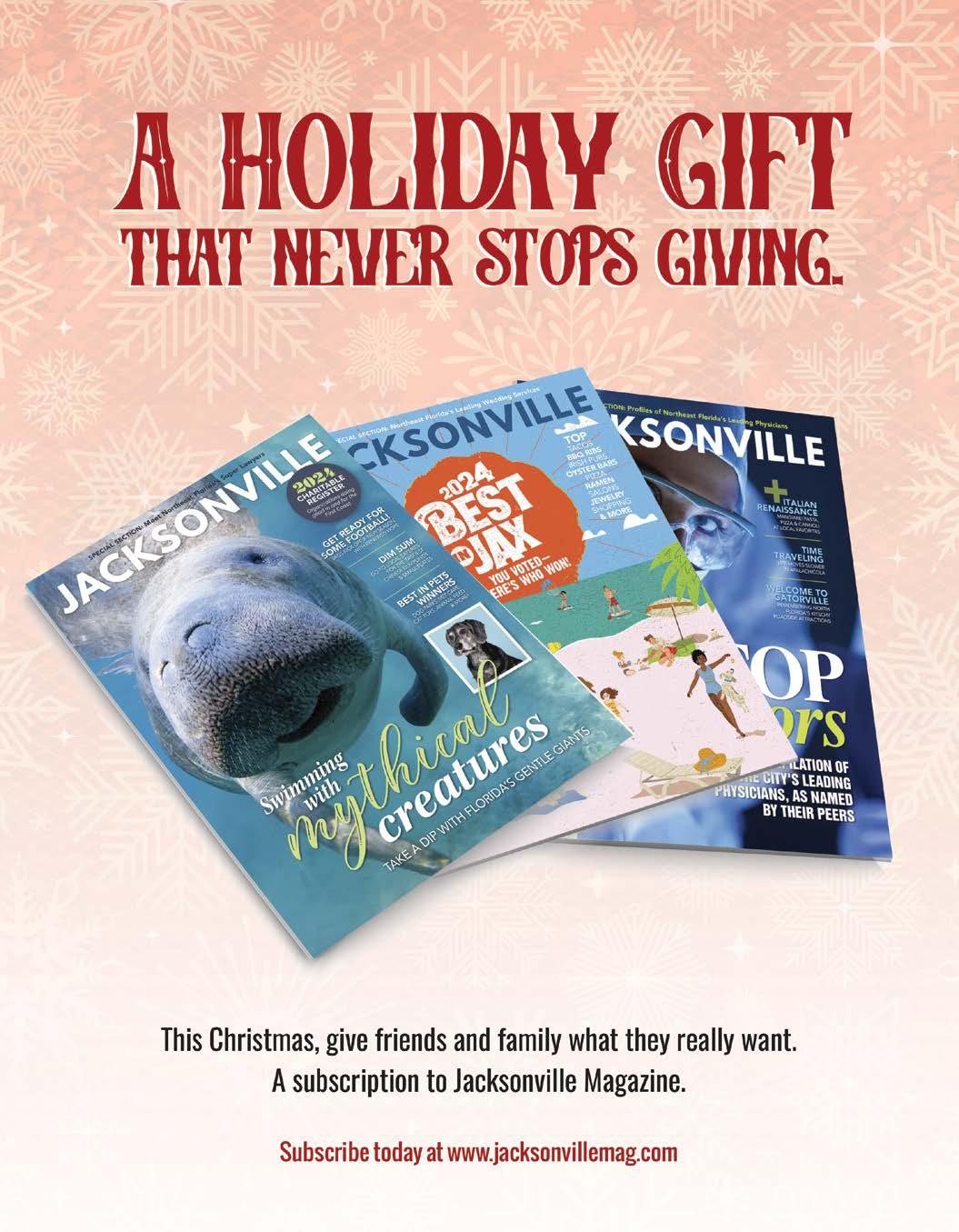 Amy Klinedinst sales director Jessica Lindsay accounting/ office manager Wendy Castro advertising coordinator/ event manager Jared Alexander proofreader Kathy Weedon history editor Tim Gilmore contributing photographer Andrew Varnes contributing graphic designer Jefferson Rall subscription requests/inquiries circulation@jacksonvillemag. com. JACKSONVILLE (ISSN 1070-5163), (USPS 749870), Volume 40 Issue 7. Published eight times per year with three supplements annually for $19.90 per year by White Publishing Co., 1650 Margaret St., Suite 302, PMB #379, Jacksonville, FL 32204. All editorial contents ©2024 by White Publishing Co. All rights reserved. Periodical postage paid at Jacksonville, FL. POSTMASTER: Send address changes to JACKSONVILLE, 1650 Margaret St., Suite 302, PMB #379, Jacksonville, FL 32204. Printed in the USA.