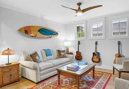 Their New York roots come through in the several Stickley furniture pieces throughout the house. Both Connie and Russ enjoy folk art, and New England artist Ralph Cahoon provides some of their favorite pieces. Supporting local art is another shared passion and is on full display throughout the home, with a painting by Atlantic Beach artist Philip Walker being one of the first pieces guests encounter when they walk through the front door. The painting is enthralling on its own; however, it also has sentimental meaning because it’s titled “Peggy and Patsy,” the names of Russ’s mother and grandmother.