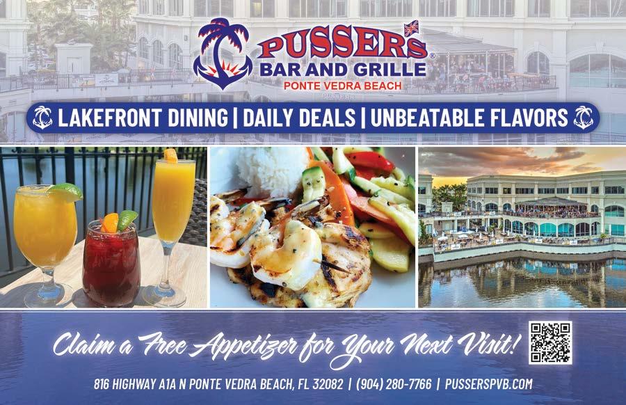 bathed in garlic lime butter. Summertime specials include roasted half-chicken, spaghetti and meatballs and classic pot roast, all under $20. The house specialty cocktail is the Painkiller, a potent combination of Pusser’s rum, pineapple and orange juices, cream of coconut and nutmeg. How about two, bartender? And a Goombay Smash, please. Live music on the upper deck every weekend. Private event space for up to 200 guests. 816 Hwy. A1A N., Ponte Vedra Beach (904-280-7766; pusserspvb.com) L, D.