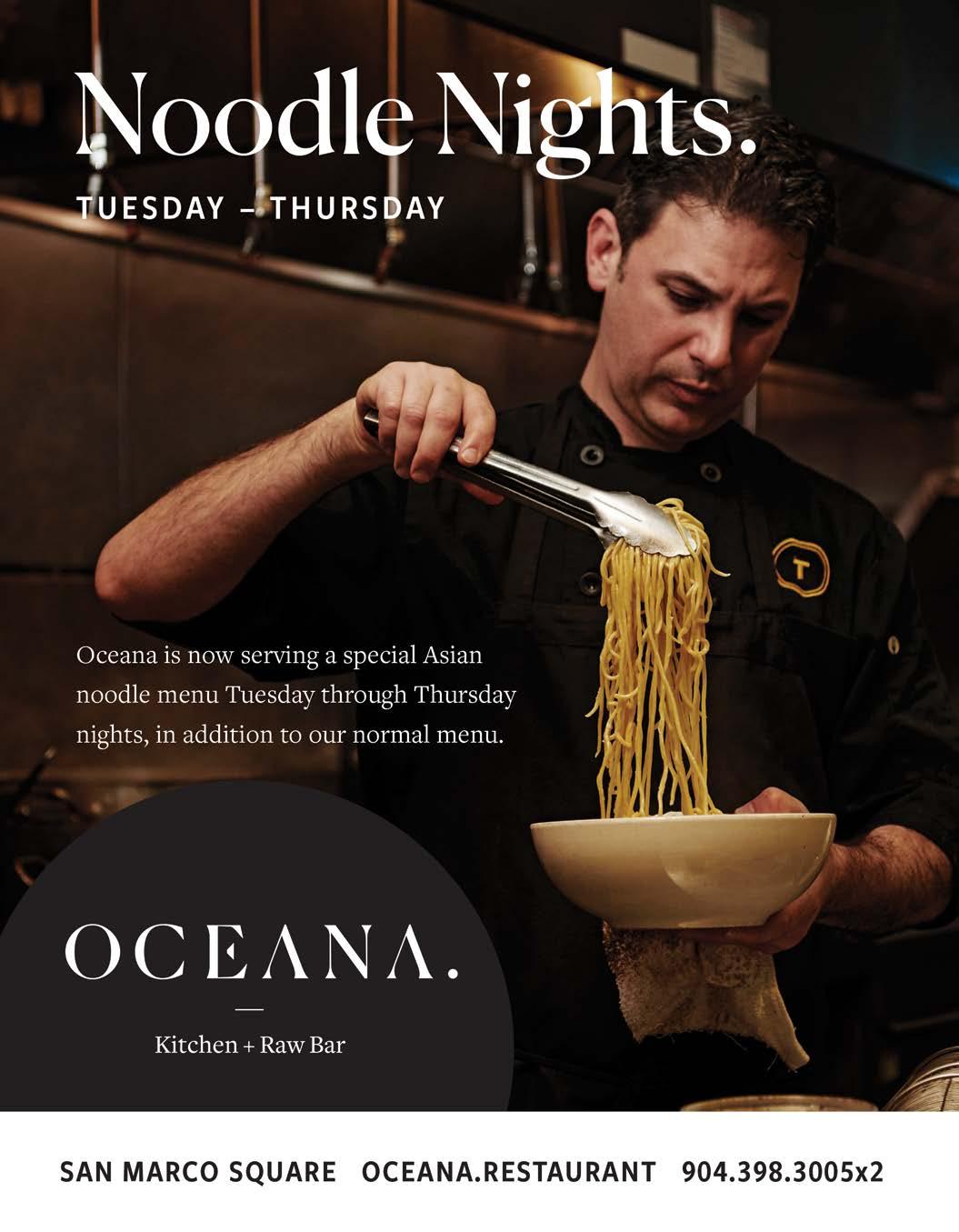 Taverna Oceana is a seafood-forward concept featuring fresh takes on beloved dishes, inspired by culinary traditions from around the world. Patrons are invited to explore coastal classics with a global flair, craft cocktails, award-winning wines, and a tempting champagne bar, all in one place. The daily selection of oysters is presented with house-made cocktail sauce and sesame-cucumber kimchi mignonette. The fruits of the sea continue with shrimp cocktail, tuna poke, marinated calamari, steamed crab legs, warm lobster roll, miso-glazed salmon and roasted oysters. The Vietnamese seafood stew of mussels, clams, crab, coconut cream, lemongrass and glass noodles is a house specialty. Catering, private dining room and event space rentals available. 1988 San Marco Blvd [904.398.3005; oceana.restaurant] D.