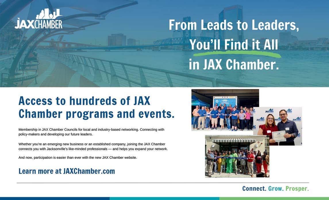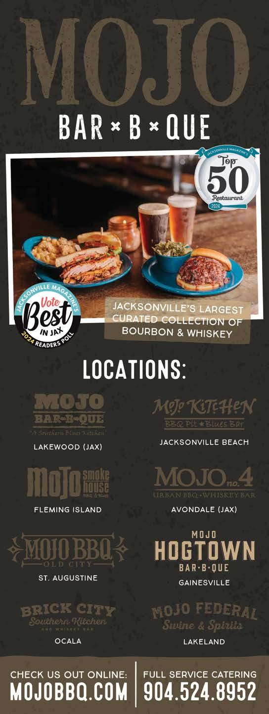 PUBLISHER/EDITOR-IN-CHIEF Joseph White CREATIVE DIRECTOR Amy Klinedinst SALES DIRECTOR Jessica Lindsay ACCOUNTING/OFFICE MANAGER Wendy Castro ADVERTISING COORDINATOR Jared Alexander PROOFREADER Kathy Weedon HISTORY EDITOR Tim Gilmore STAFF PHOTOGRAPHER Andrew Varnes CONTRIBUTING GRAPHIC DESIGNER Jefferson Rall CONTRIBUTING WRITERS/PHOTOGRAPHERS Laura Evans, Fabrizio Gowdy, Marie Hough, Christina Karst, Rachael Osborn, Jeffrey Spear SUBSCRIPTION REQUESTS/INQUIRIES circulation@jacksonvillemag.com. JACKSONVILLE (ISSN 1070-5163), (USPS 749870), Volume 40 Issue 3. Published eight times per year with three supplements annually for $19.90 per year by White Publishing Co., 1650 Margaret St., Suite 302, PMB #379, Jacksonville, FL 32204. All editorial contents ©2024 by White Publishing Co. All rights reserved. Periodical postage paid at Jacksonville, FL. POSTMASTER: Send address changes to JACKSONVILLE, 1650 Margaret St., Suite 302, PMB #379, Jacksonville, FL 32204. PRINTED IN JACKSONVILLE. JACK SONV ILL E