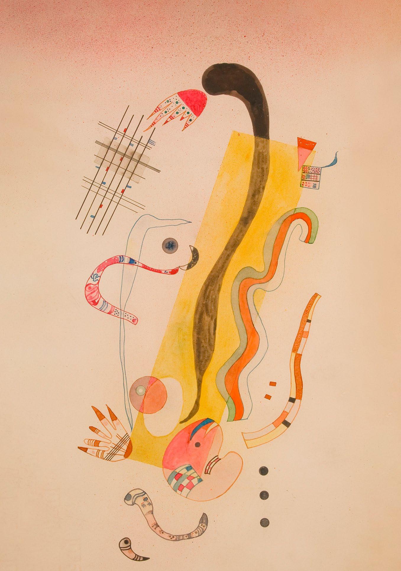 Settled in Neully, on the outskirts of Paris, this is one of the first works of that period. The influence of the Surrealists, whom he began to frequent, is slightly visible in this work, executed on paper with ink and watercolour. The latter material allowed Kandinski to graduate the colour and create semi-transparent masses. In Rampant geometrical elements, more typical of the disciplined Bauhaus school, are mixed with other organic elements, which the painter introduced into his work from this point onwards.