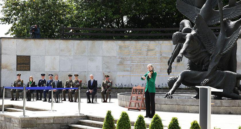 Violinist Aoife Ní Bhriain perform ing An Buachaill Caol Dubh at t he Garden of Rem em brance w hile t here w as a reading of t he Pat rick Kavanagh poem Peace and prayers led by Defence Forces chaplain Fr Dan McCart hy