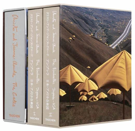 415 Taschen Collector’s Edition. Umbrellas Japan-USA, 1984-91, by Christo and Jeanne-Claude, 2 volumes, limited edition, Cologne: Benedikt Taschen, 1998, numerous colour and monochrome photographic illustrations by Wolfgang Volz, original cloth, slipcase, 4to, limited edition 1974/2500, signed by Christo, Jeanne-Claude and Wolfgang Volz, together with The Gates, Central Park, New York City 1979-2005, limited edition, Cologne: Taschen, 2005, numerous photographic illustrations by Wolfgang Volz, sample of orange fabric tipped-in, original cloth, slipcase, 4to, limited signed edition 4547/5000