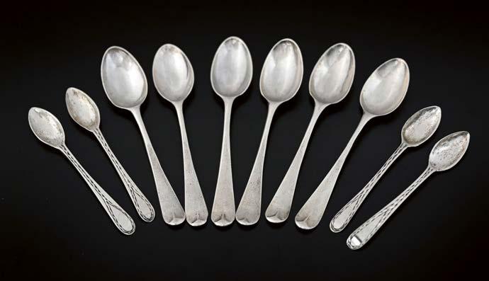 15 A collection of four marrow scoops, comprising a George III silver beadedge example, William Sumner & Richard Crossley, London 1774, length 21.9cm, a George III silver feathered-edge example, maker’s mark rubbed, London 1781, and two electroplated marrow scoops, combined weight of hallmarked examples 99g/3.18ozt approx (4) £120 - £180