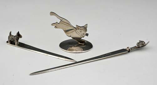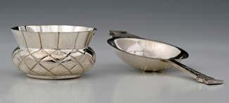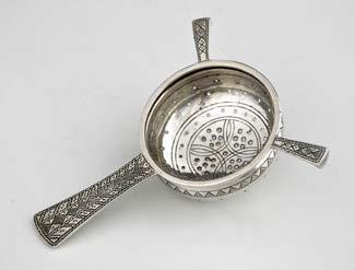 Finally, amongst the assorted curiosities, including pieces of ‘medical silver’, I offer a group of tea strainers, essential utensils in the making of a proper cup of tea, which developed from simple pierced spoons with spiked handles, (19th century antique dealers re-named these strainers ‘Mote Spoons’), through the little buckets intended to hang from teapot spouts, introduced in the 1770’s, and on to infusers of various shapes and two-handled strainers based on the earlier lemon strainer but completed with little stands to hold drips of liquid.