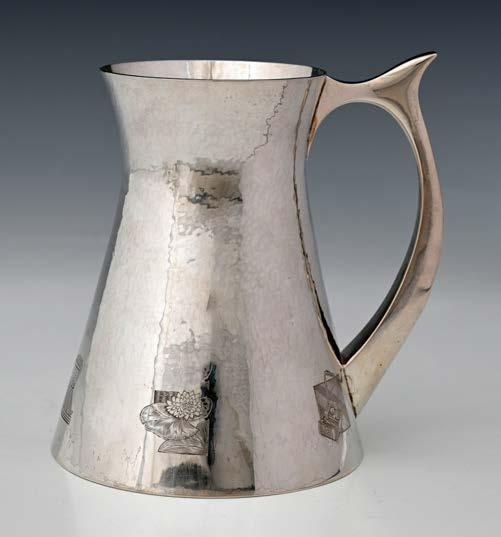 From the nineteenth century I am offering a few pieces made by the brothers Henry William and Louis Dee, who supplied extraordinary objects to the retail trade: their careers coincided with the early period of the Martin Brothers, pottery manufacturers, and some of the Dee’s bizarre designs are comparable to the Martin brothers’ work. I am also offering pieces made by the firm of Hukin and Heath, a partnership which, from 1870, when John Thomas Heath became Hukin’s partner, manufactured articles in silver-plate and in silver, using innovative design and the latest techniques. From the mid 1870’s into the 1880’s the firm employed the designer Dr. Christopher Dresser, of course, and his association with the firm thereafter, in the absence of archival proof, remains the subject of much uncertainty and speculation. My concern, in writing the article ‘The Partnership of Hukin and Heath’ was to focus on the family which ran the business and to point up their continuing enthusiasm for modern style: supplying articles fit for the new industrial age, often working in collaboration with ceramic manufacturers like Doulton and Coalport, and with glass makers, like Stevens and Williams. A significant part of the offering in this sale focuses on the ‘naturalistic’ objects – surely deriving from Dr. Dresser’s botanical and ‘aesthetic’ interests – which developed from the lotus bowls of the early 1880’s through to the range of ‘hammered’ designs displayed by Hukin and Heath at the Exposition Universelle in Paris in 1900.