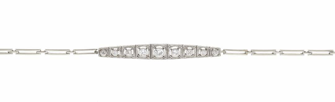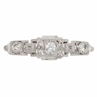 16 An early 20th century platinum oldcut diamond bar brooch, estimated total diamond weight 0.60ct, predominantly H-I colour, SI clarity, length 4.5cm, 3.5g £200 - £400