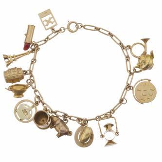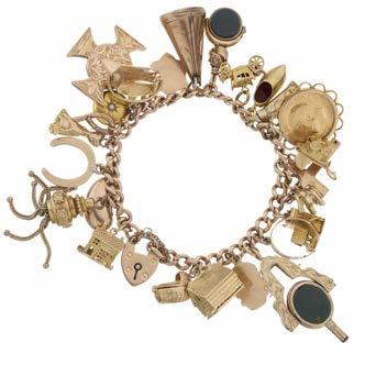 39 A 9ct gold curb-link charm bracelet with heart-shape padlock clasp, charms to include a fan, two cars, a bible and a hinged fortune teller’s caravan, bracelet with hallmarks for London 1977, clasp with hallmarks for London 1976, some charms with hallmarks, length 18cm, total weight 102g £2,200 - £3,200