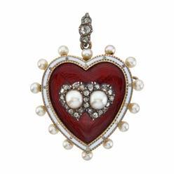 9 A late Victorian rose-cut diamond, pearl and red guilloche enamel sweetheart pendant, may also be worn as a brooch, personal engraving to reverse dated 1898, length 3cm, with fitted case, 8.9g £300 - £500