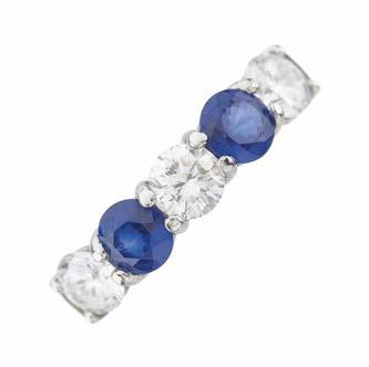 46. An 18ct gold brilliant-cut diamond and sapphire five-stone ring, estimated total diamond weight 1.05ct, G-H colour, VS clarity, estimated total sapphire weight 0.90ct, band stamped 750, ring size J, 4.9g £300 - £500