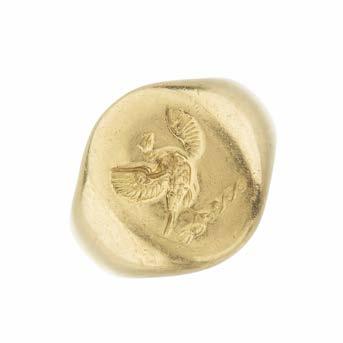 26 An 18ct gold signet seal ring, with engraved bird motif, band stamped 18ct, ring size I1/2, 9.4g