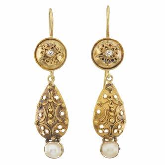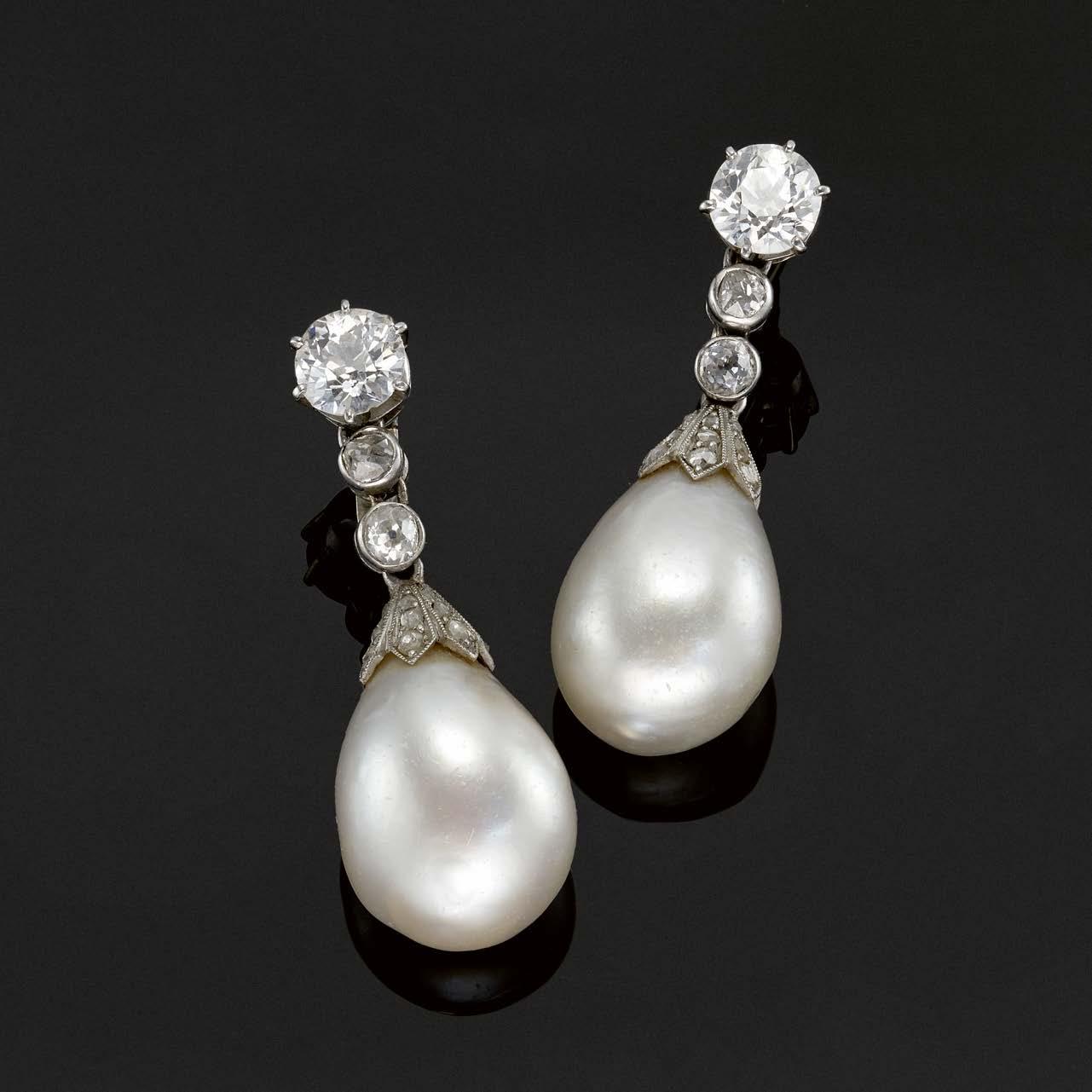 45 An exceptional pair of Belle Epoque natural pearl and old-cut diamond drop earrings, with rose-cut diamond cap, with report from AnchorCert stating natural, saltwater, pearls measure approximately 19mm by 12mm and 19mm by 11.3mm respectively, estimated total diamond weight 2ct, H-I colour, SI clarity, foreign assay marks, length 3.2cm, 9.1g £20,000 - £40,000